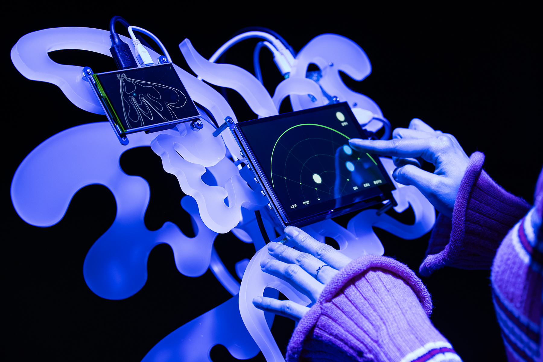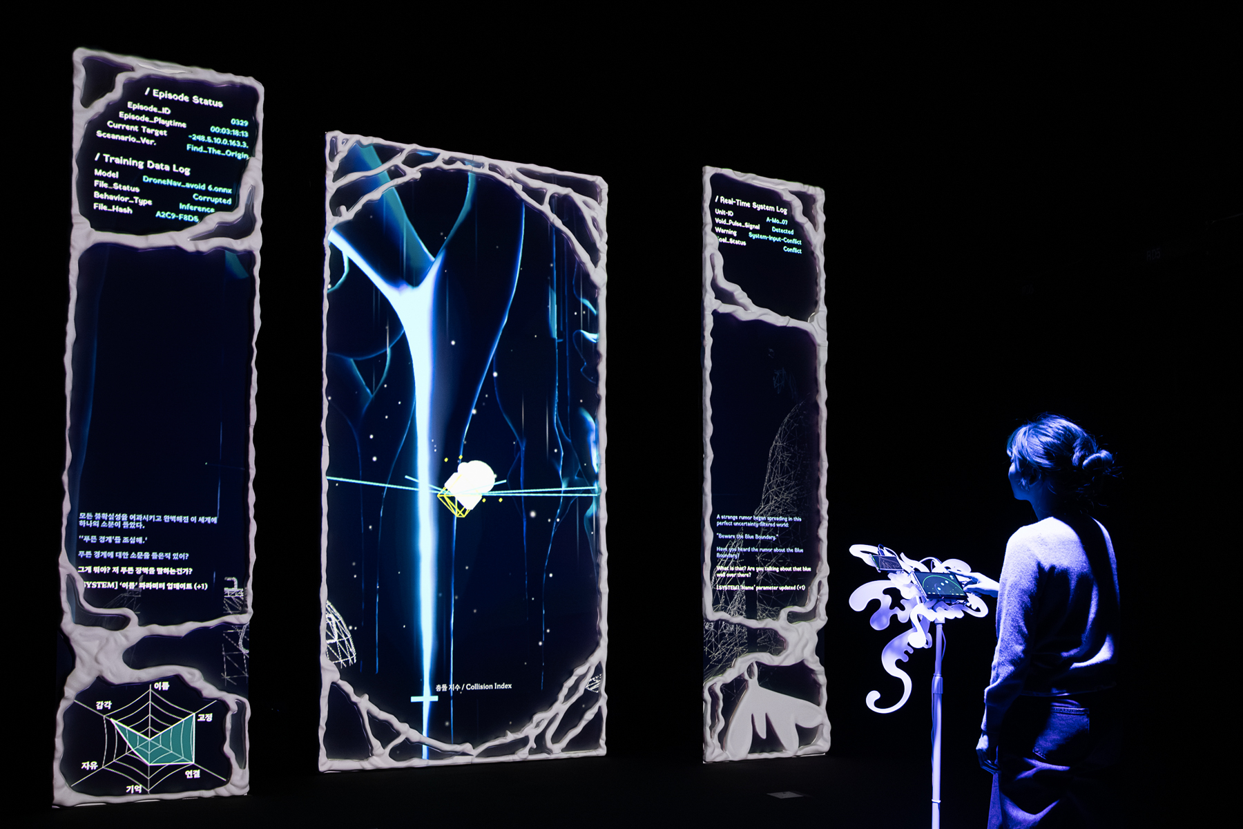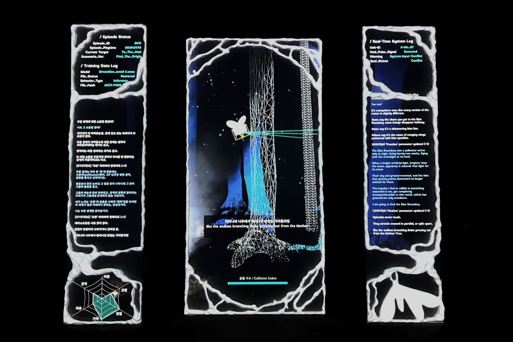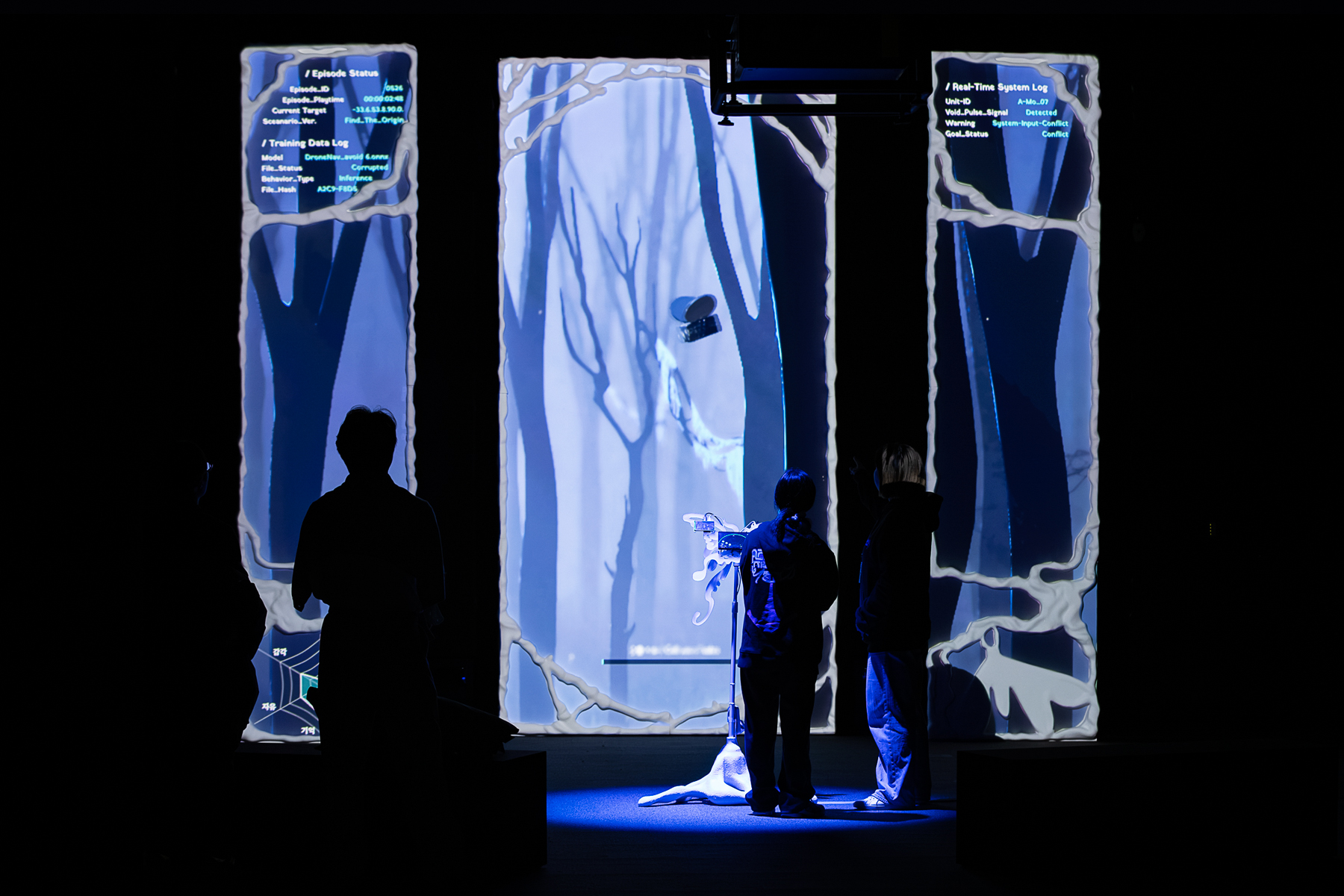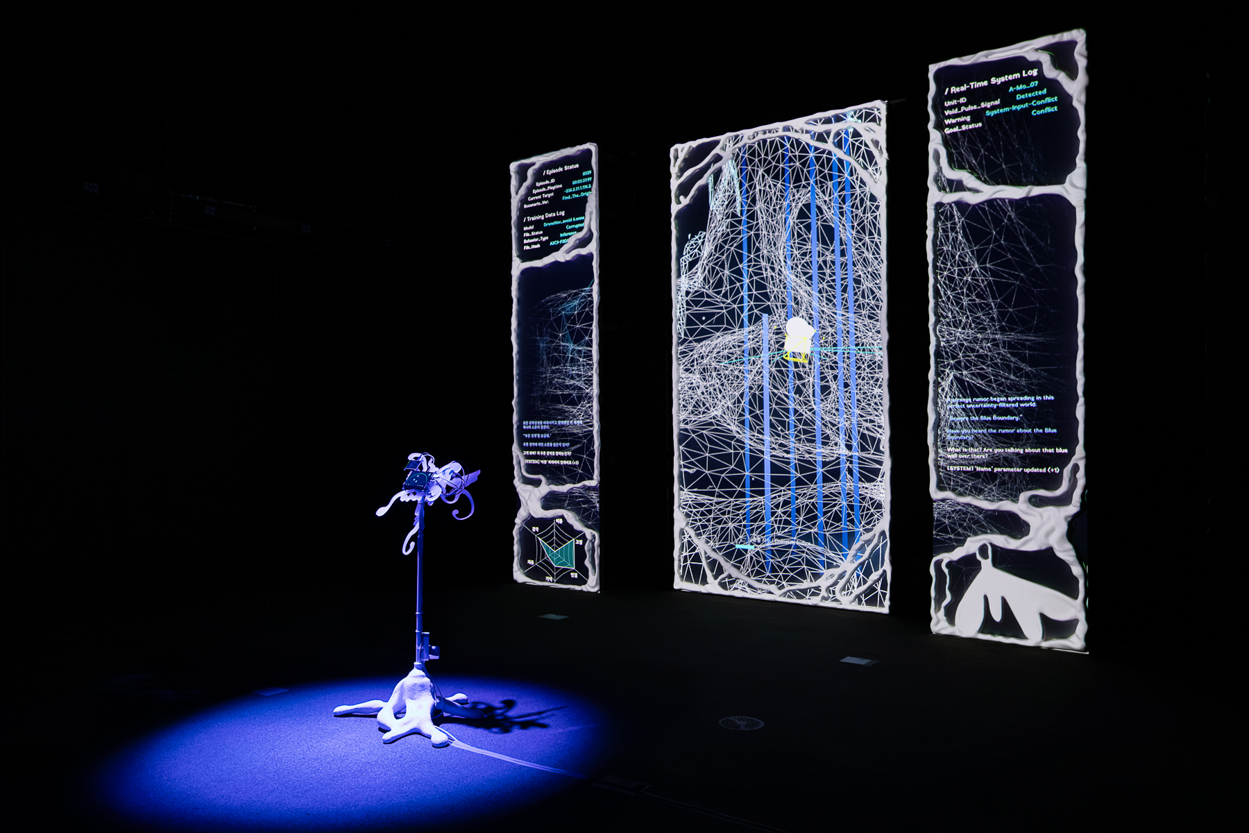 The “blue boundary” represents both the technical limits that define zones of possible existence—seen in digital maps, VR, and games—and the symbolic trace of a mythical blue-spotted moth. Visitors can alter A-mo’s impulses through the controller placed in the central Interaction Zone, experiencing the journey shaped by A-mo’s movements from within or outside the boundary.
