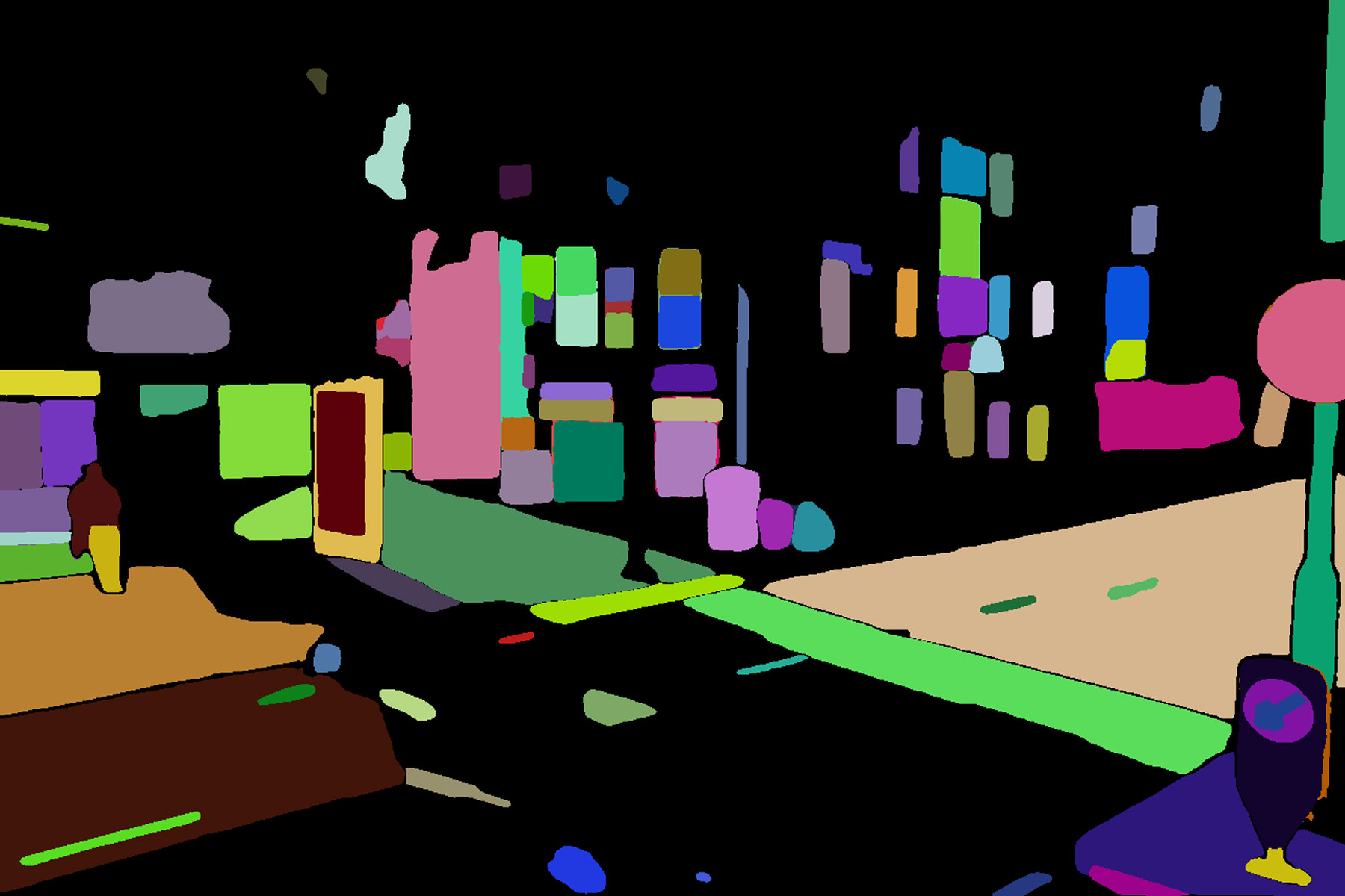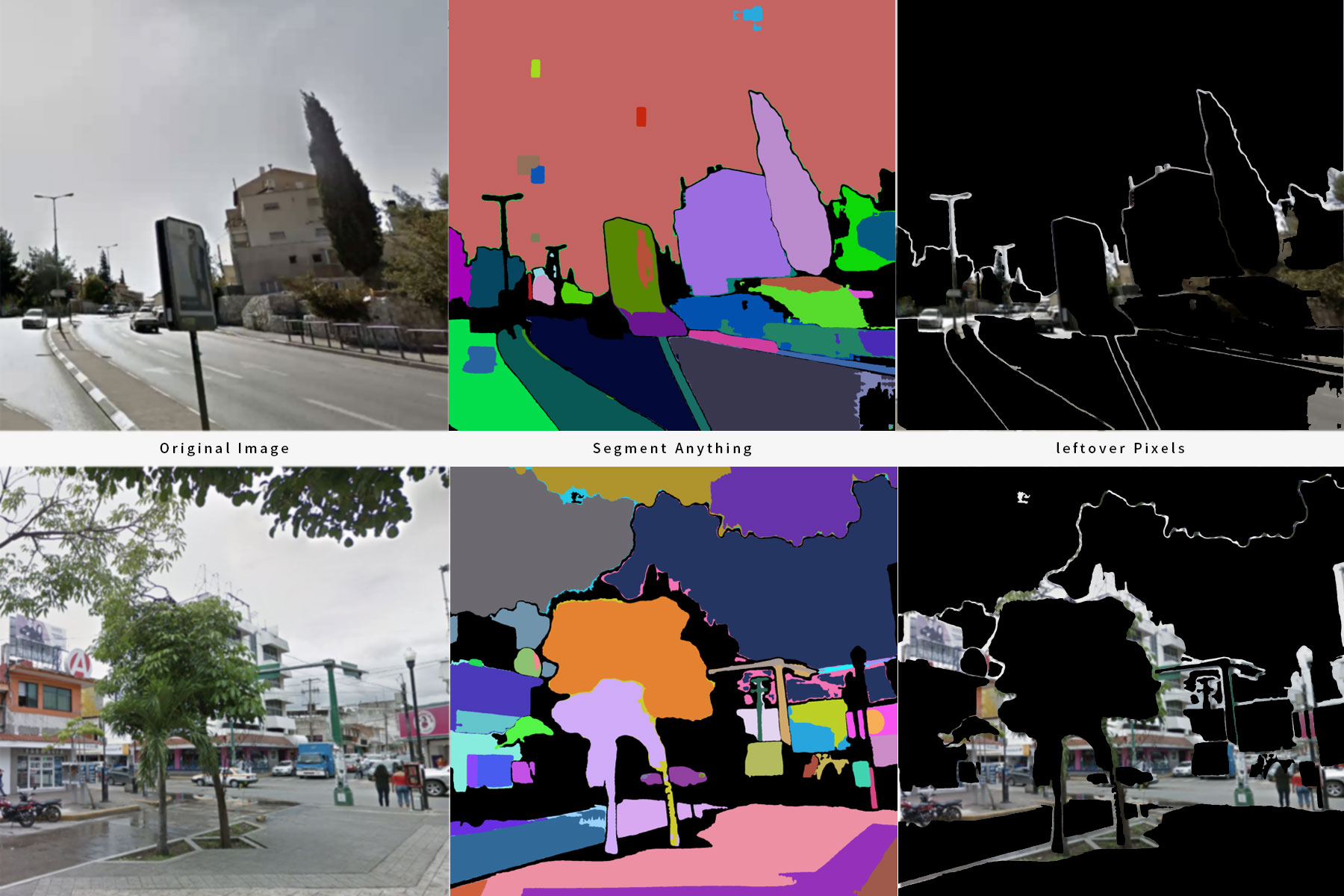 이러한 문제의식 아래, 우리는 ‘스트리트뷰 이미지에서 AI는 무엇을 보고 있는가?’라는 질문을 품고, Meta AI의 Segment Anything 모델(SAM)을 스트리트뷰 데이터에 적용하기 시작했다. 이 실험은 단순한 기술 테스트가 아니라, 기술이 보는 시선—무엇을 분할하고, 어디까지를 객체로 인식하며, 무엇을 남기고 무엇을 삭제하는가—를 역으로 추적하는 과정이었다. 스트리트뷰 이미지 속에서는 다양한 객체들이 분할되지만, AI가 놓치는 픽셀들, 즉 라벨링되지 못한, 검은 공간들이 명확하게 드러났다. 이 '흔적'은 기술이 감지하지 못하는 세계의 모습이자, 그 경계 바깥에 존재하는 분류되지 않는 존재들의 자리였다.