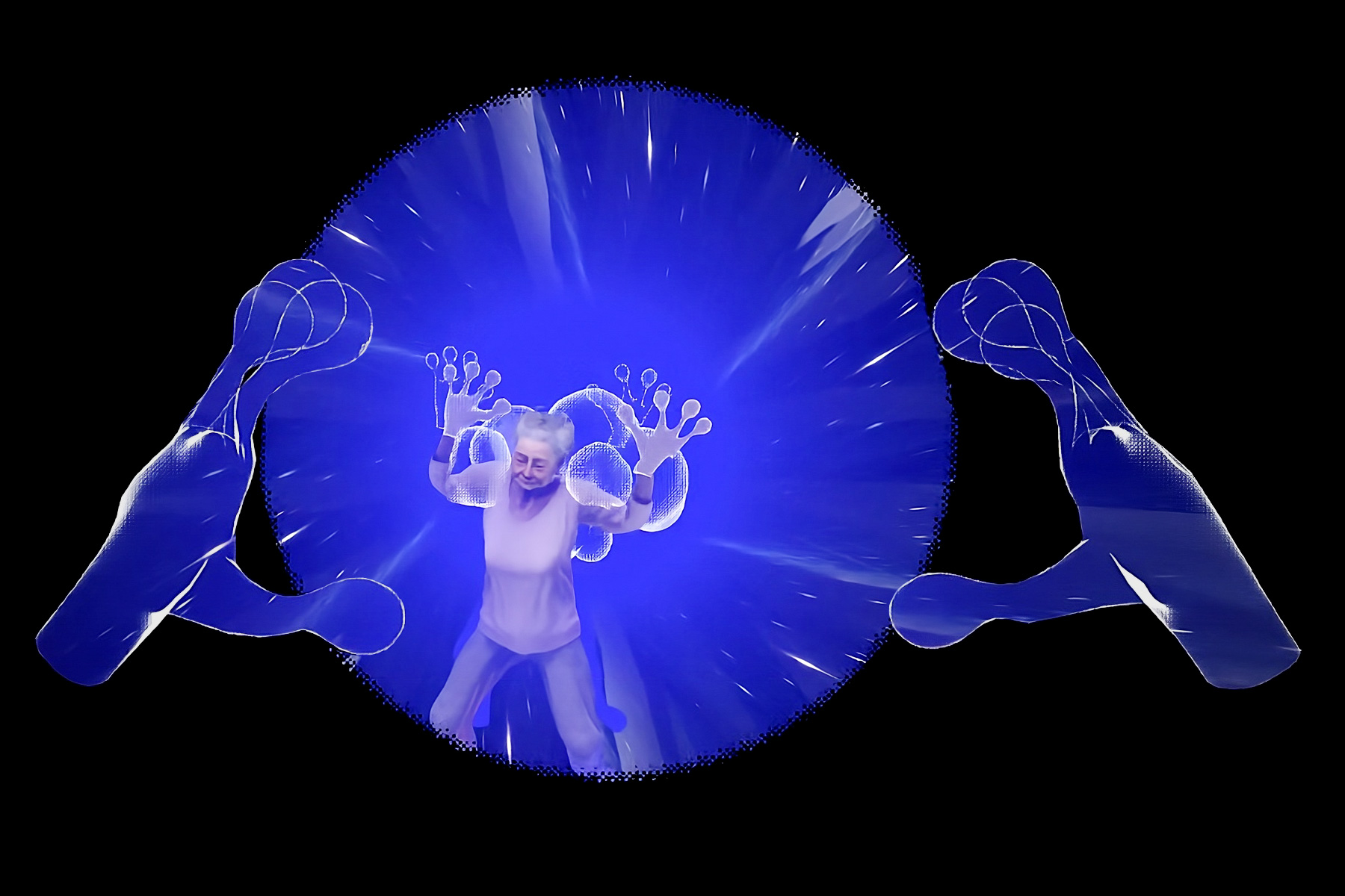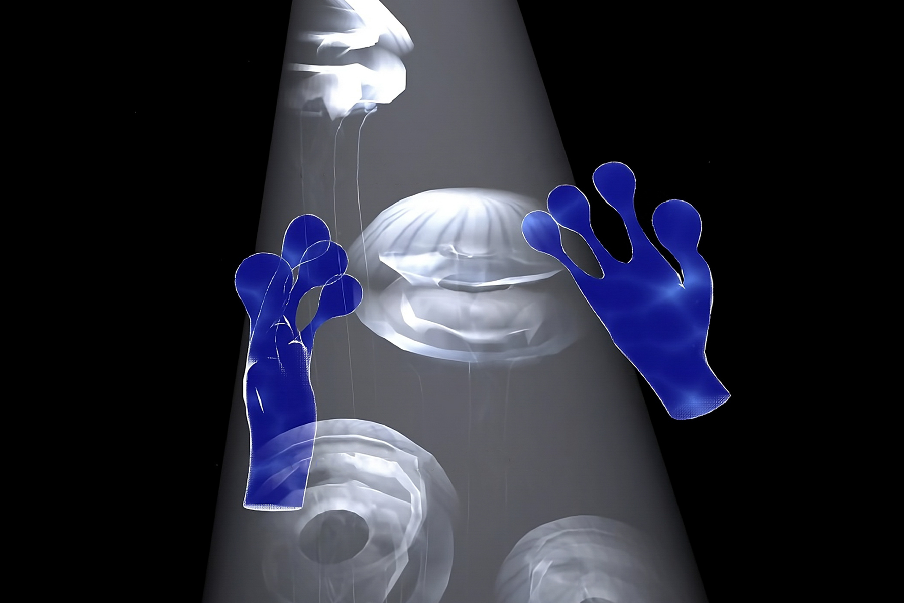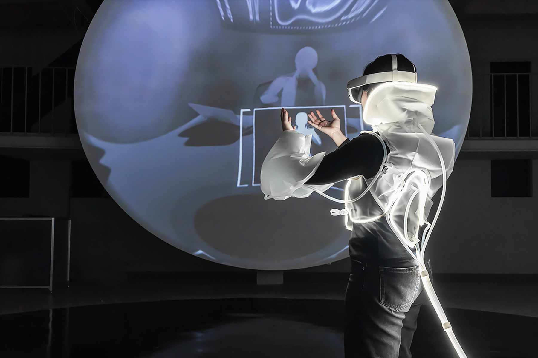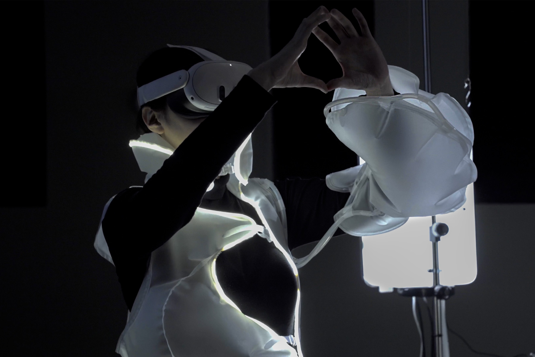 The audience wears a VR headset and a pneumatic wearable interface, participating in the narrative by forming circles with their hands under the guidance of the narrator (or system). The inflation and deflation of the air-suit translates the ‘volume’ of virtual space into tactile sensation. Rather than perceiving the story as images alone, the audience experiences it through pressure, breath, and bodily transformation.
