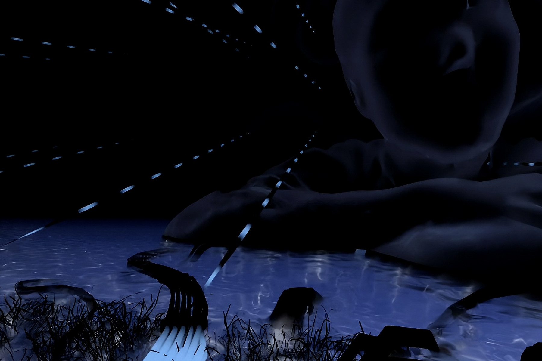 ⟪Voooooo---Peeeeee---⟫ is a multisensory XR experience that follows a woman whose body has developed a large cavity after being reconstructed as data. One day, the narrator begins to hear the sound of wind leaking from inside her body. In the emptied space, an unfamiliar creature takes residence, inflating and deflating a thin membrane, repeating a rhythm of swelling and collapse. Her monologue drifts between memories of loss, clouds of data beneath the sea, and images of endlessly replicated virtual worlds.