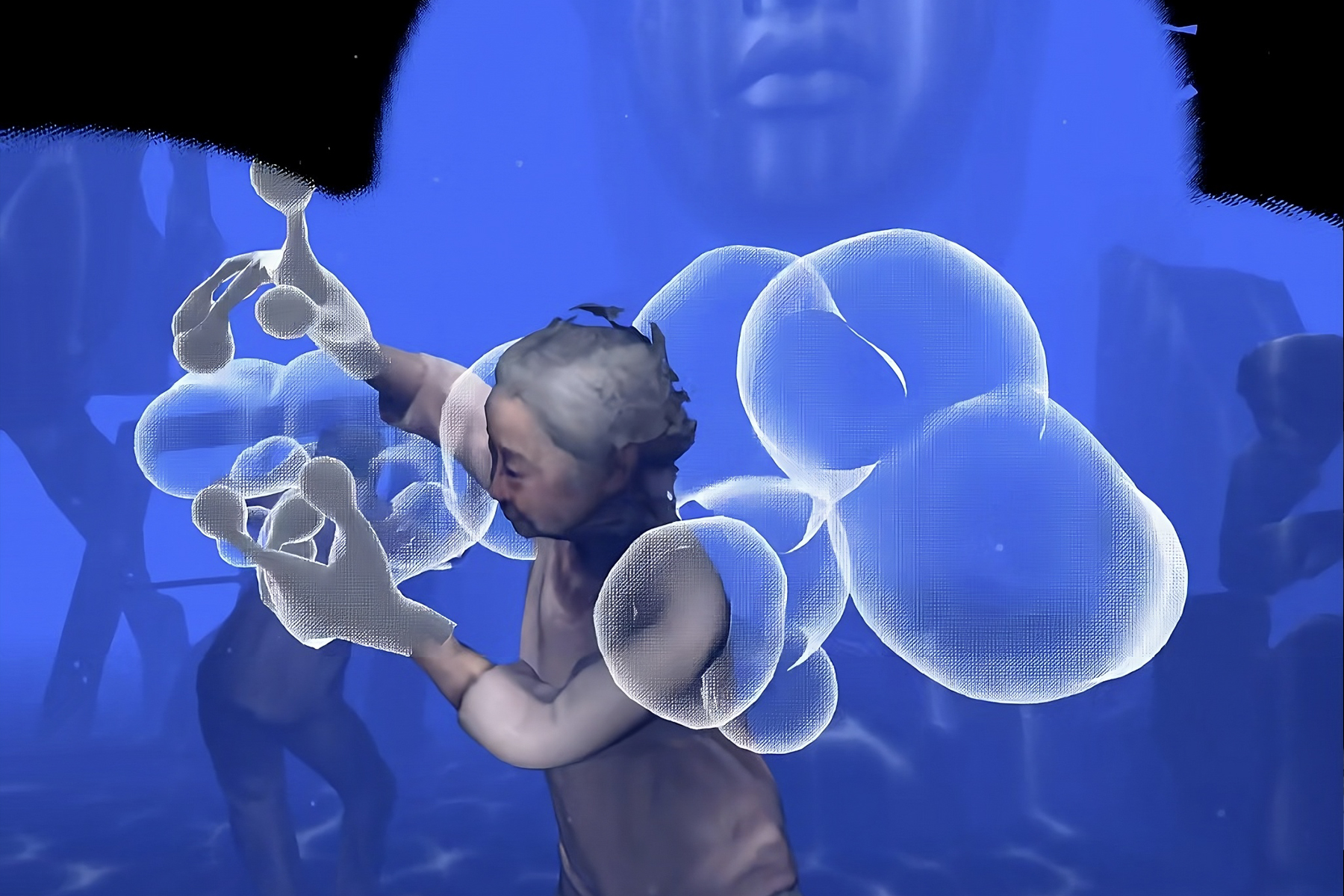 ⟪Voooooo---Peeeeee---⟫ originates from a CT image of the artist’s grandmother, whose aging body revealed an unexpected void within. The ‘hole’ discovered in this technologically reconstructed body exposes a gap between the living body and its technical representation, becoming the point of departure for the work’s narrative and sensory structure. This absence extends beyond a personal bodily experience, overlapping with technological infrastructures such as digital twins that replace actors’ movements and massive data centers buried beneath the sea. Through these overlaps, the work expands toward a conceptual and sensory world defined as Volumetric Virtuality.